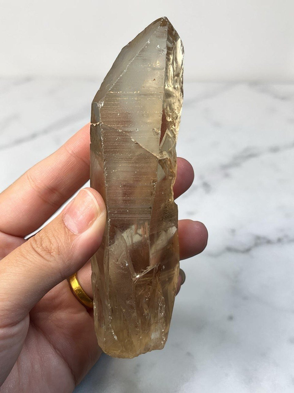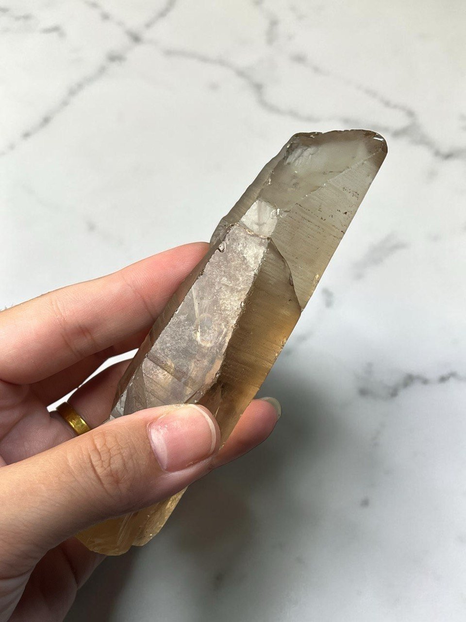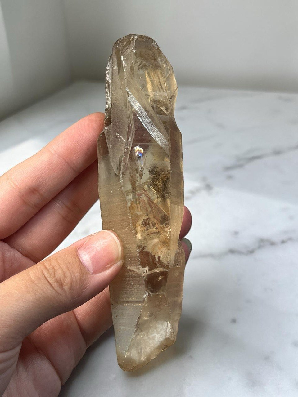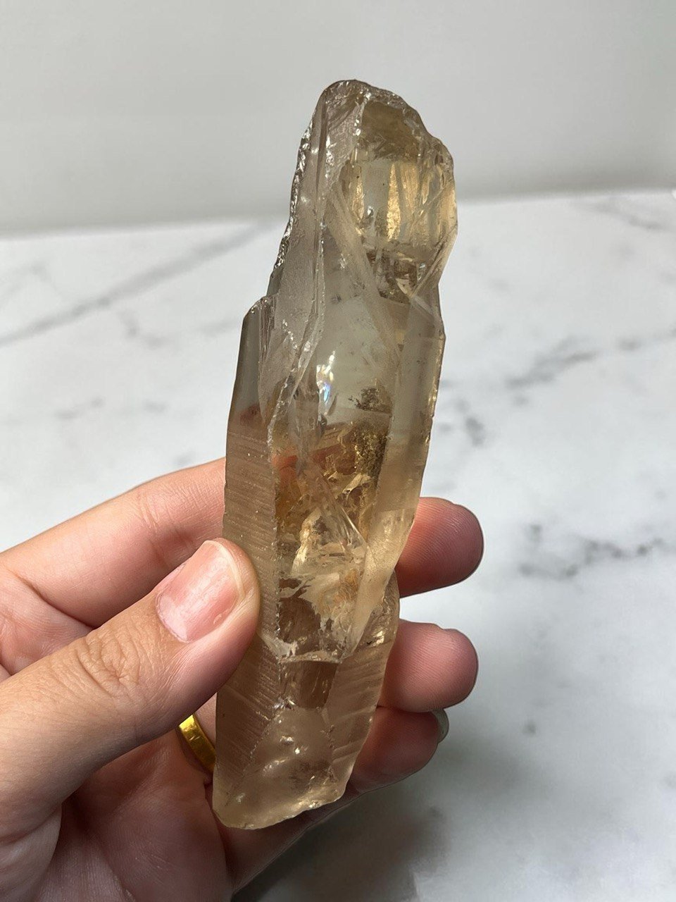这是一颗天然双尖茶晶,内部带有多处彩虹光感。