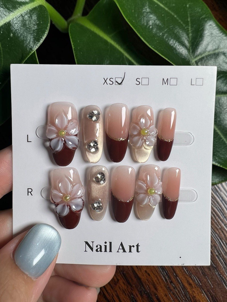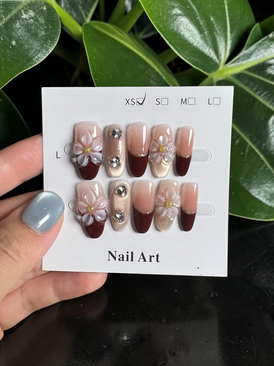 这款穿戴甲以酒红法式与奶茶裸色为主调,搭配立体花朵与精致水钻点缀,整体风格温柔浪漫,同时带有复古轻奢气质。