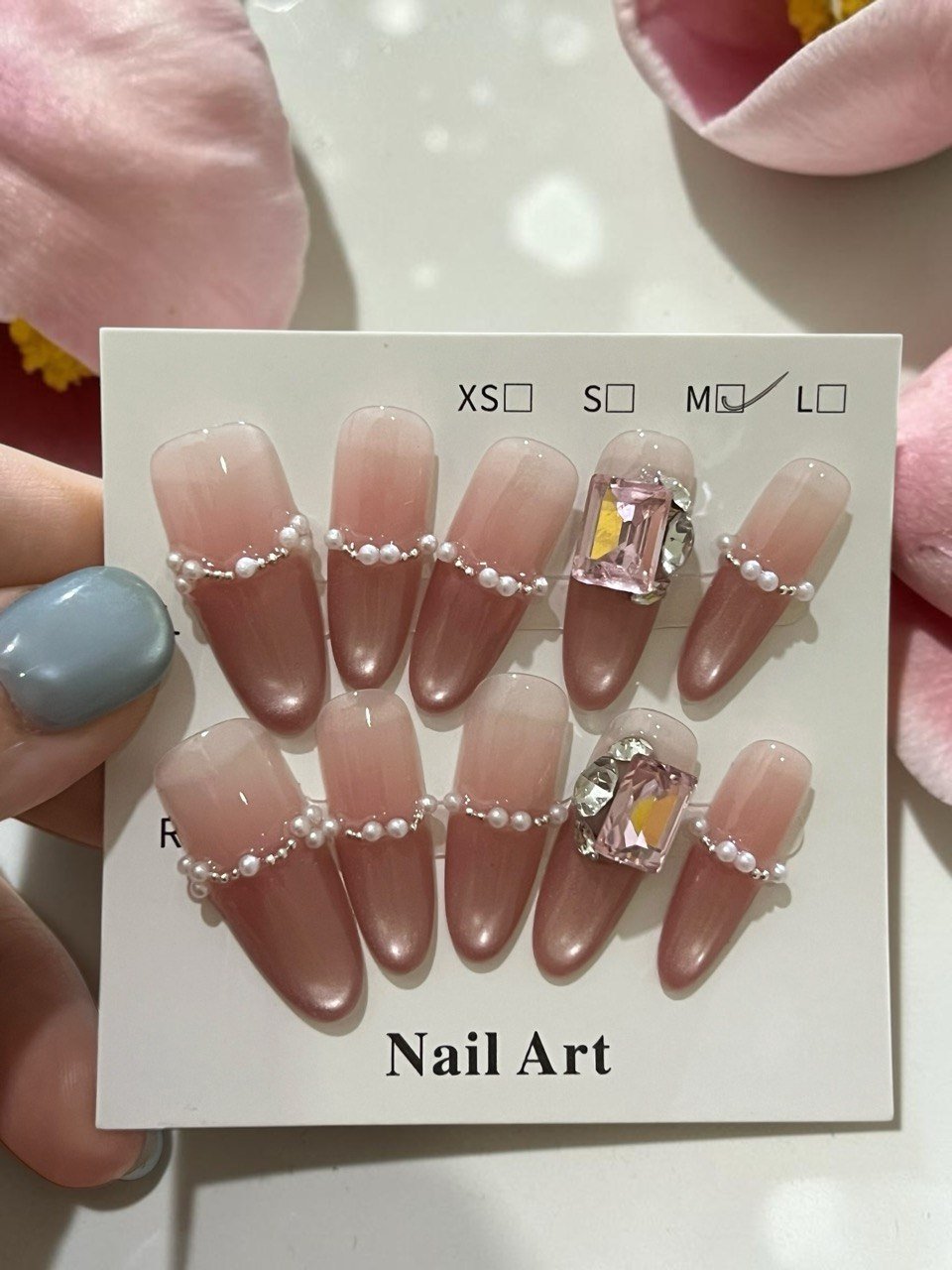 Pearl press on nails designed with a nude gradient base and elegant crystal accents, creating a luxurious and refined look.