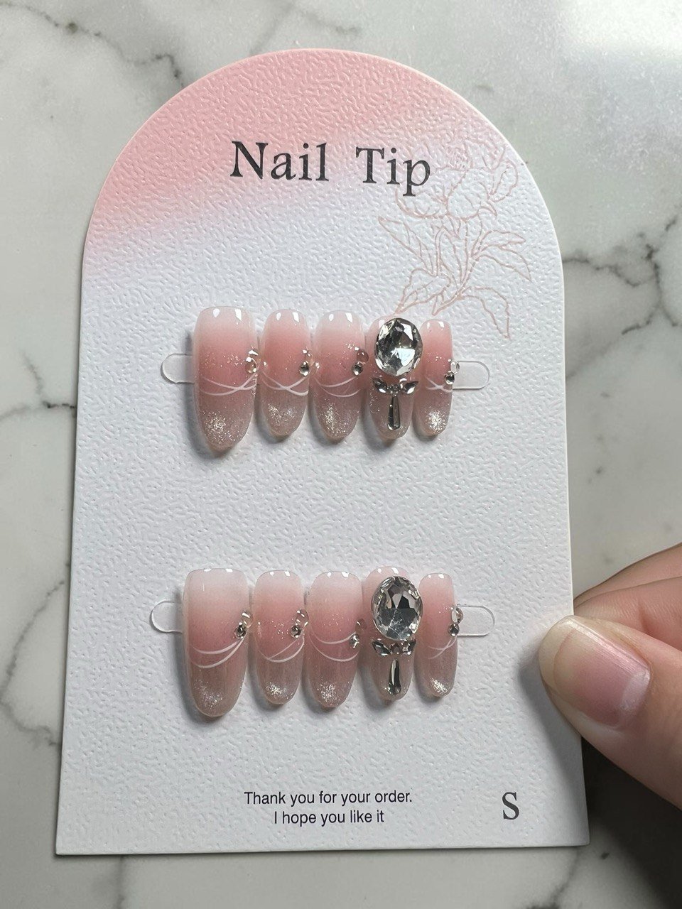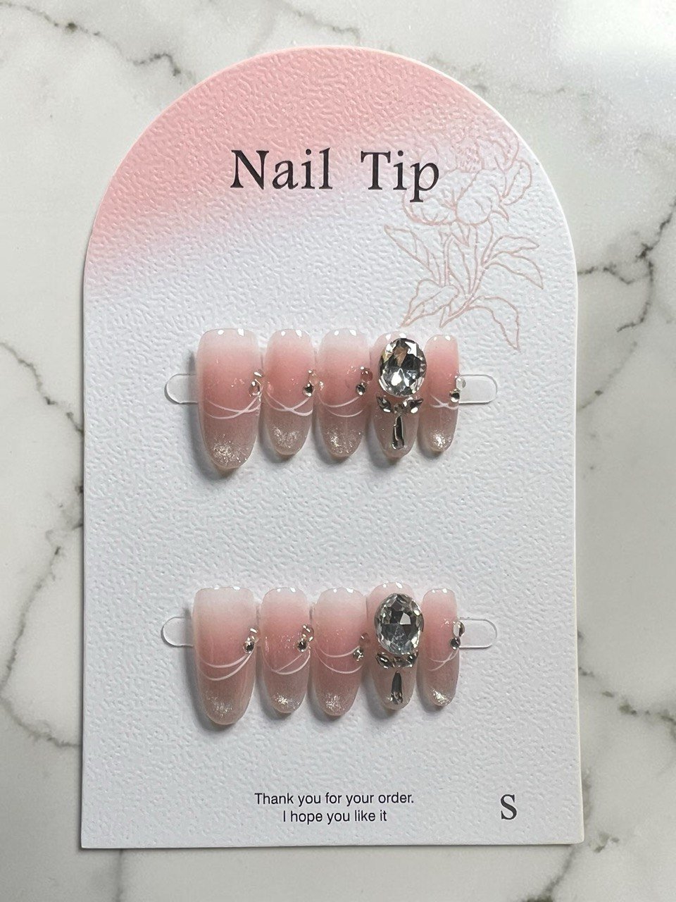 裸粉渐变打底,法式弧线增加优雅感,搭配水钻与主钻点缀,让整体更有层次与设计感。