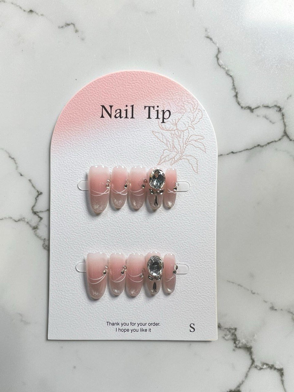 这款穿戴甲以裸粉渐变为主调,融合细致法式线条 + 水钻流苏 + 主钻点缀,整体风格温柔优雅,带有明显的轻婚礼与精致感。