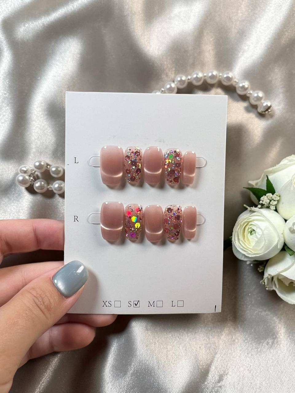 The nude base keeps the look clean and wearable, while the glitter sections add a striking visual highlight.