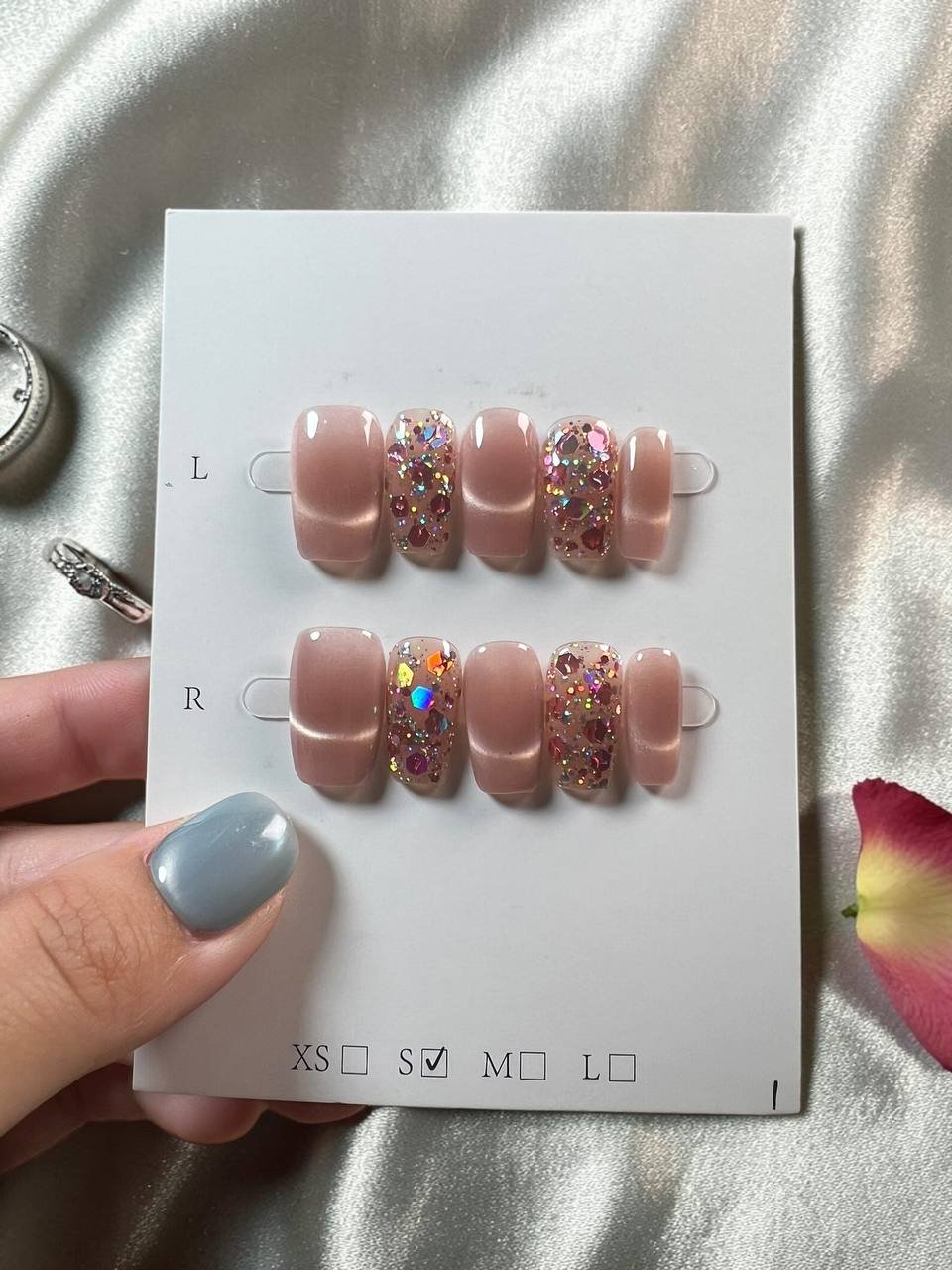 These nude cat eye glitter press on nails combine a soft reflective cat eye base with concentrated glitter accents, creating a contrast between minimal elegance and bold sparkle.