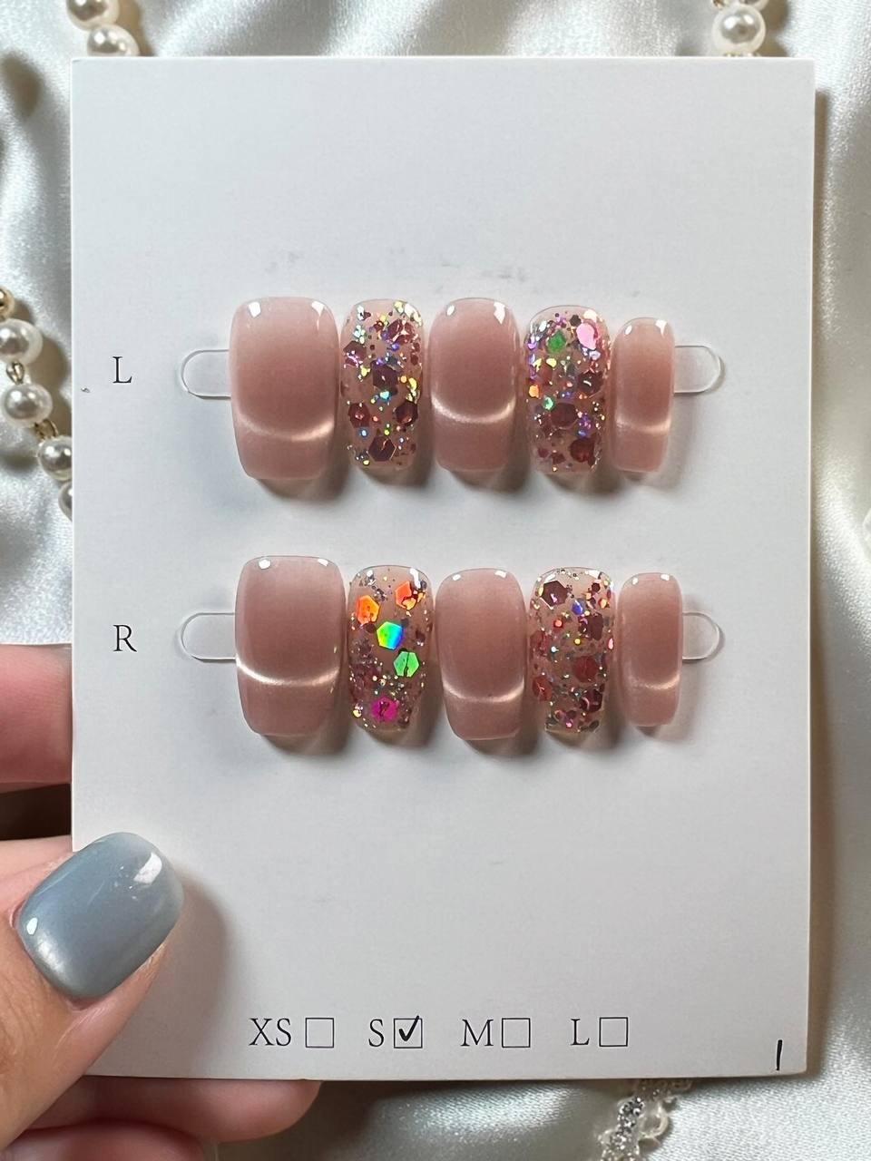 Nude cat eye glitter press on nails are a perfect choice for creating a soft yet eye-catching manicure at home. This nude pink design features a subtle cat eye shimmer base combined with bold multicolor glitter accents, creating a look that is both elegant and playful.